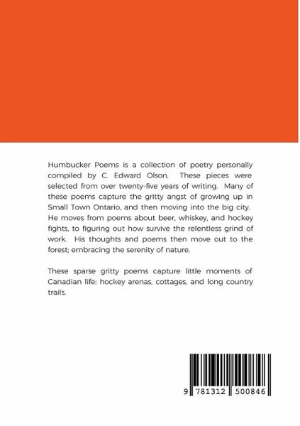Humbucker Poems is a collection of poetry personally compiled by C. Edward Olson. These pieces were selected from over twenty-five years of writing. Many of these poems capture the gritty angst of growing up in Small Town Ontario, and then moving into the big city. He moves from poems about beer, whiskey, and hockey fights, to figuring out how survive the relentless grind of work. His thoughts and poems then move out to the forest; embracing the serenity of nature. These sparse gritty poems capture little moments of Canadian life: hockey arenas, cottages, to long country trails.