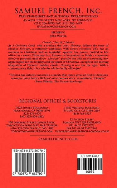 Holiday Drama / 8m, 6f (doubling possible)/ Interior Set As "A Christmas Carol" with a modern day twist, Humbug follows the story of Eleanor Scrooge, a ruthlessly ambitious Wall Street executive who has an aversion to Christmas and an insatiable appetite for power. Locked in her office on a snowy Christmas Eve, Eleanor is determined to finish a corporate-takeover proposal until three "advisors" provide her with an eye-opening new appreciation for the holidays and the spirit of Christmas. An upb