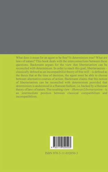 What does it mean for an agent to be free? Is determinism true? What are laws of nature? This book deals with the interconnections between these questions. Backmann argues for the view that libertarianism can be reconciled with determinism. In order to reach this goal, libertarianism - classically defined as an incompatibilist theory of free will - is defined as the thesis that at the time of decision, the agent must be able to choose between alternative courses of action. Backmann claims that this notion of libertarianism can be reconciled with determinism provided that determinism is understood in a Humean fashion, i.e. backed by a Humean theory of laws of nature. The resulting view - Humean Libertarianism - is an intermediate position between classical compatibilism and incompatibilism.