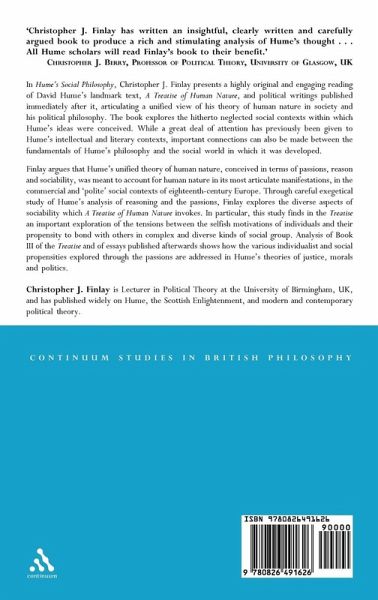 In Hume's Social Philosophy, Christopher J Finlay presents a highly original and engaging reading of David Hume's landmark text, A Treatise of Human Nature, and political writings published immediately after it, articulating a unified view of his theory of human nature in society and his political philosophy. The book explores the hitherto neglected social contexts within which Hume's ideas were conceived. While a great deal of attention has previously been given to Hume's intellectual and literary contexts, important connections can also be made between the fundamentals of Hume's philosophy and the social world in which it was developed. Finlay argues that Hume's unified theory of human nature, conceived in terms of passions, reason and sociability, was meant to account for human nature in its most articulate manifestations, in the commercial and 'polite' social contexts of eighteenth-century Europe. Through careful exegetical study of Hume's analysis of reasoning and the passions, Finlay explores the diverse aspects of sociability which the Treatise of Human Nature invokes. In particular, this study finds in the Treatise an important exploration of the tensions between the selfish motivations of individuals and their propensity to bond with others in complex and diverse kinds of social group. Analysis of Book III of the Treatise and of essays published afterwards shows how the various individualist and social propensities explored through the passions are addressed in Hume's theories of justice, morals and politics.
