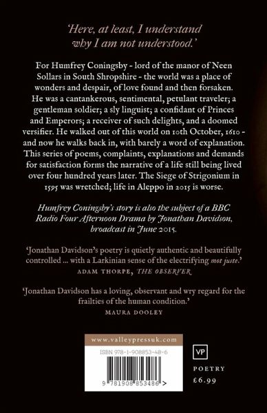 For Humfrey Coningsby - lord of the manor of Neen Sollars in South Shropshire - the world was a place of wonders and despair, of love found and then forsaken. He was a cantankerous, sentimental, petulant traveler; a gentleman soldier; a sly linguist; a confidant of Princes and Emperors; a receiver of such delights, and a doomed versifier. He walked out of this world on 10th October, 1610 - and now he walks back in, with barely a word of explanation. This series of poems, complaints, explanations and demands for satisfaction forms the narrative of a life still being lived over four hundred years later. The Siege of Strigonium in 1594 was wretched; life in Aleppo in 2014 is worse. Johnathan Davidson was born in 1964 in Didcot, South Oxfordshire, and now lives in Coventry. He won an Eric Gregory award in 1990, and is the author of Moving the Stereo (Jackson's Arm, 1993), The Living Room (Arc, 1994), A Horse Called House (Smith/Doorstop, 1997) and Early Train (Smith/Doorstop, 2011). He has had eight radio plays broadcast on BBC Radio 3 and 4, along with radio adaptations of Geoffrey Hill's Mercian Hymns and W.S. Graham's The Nightfishing.