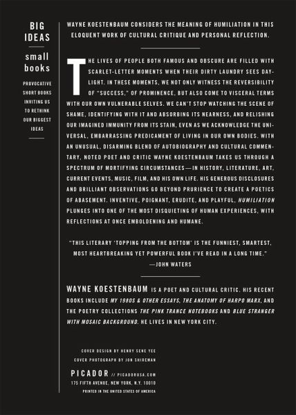 Wayne Koestenbaum considers the meaning of humiliation in this eloquent work of cultural critique and personal reflection. The lives of people both famous and obscure are filled with scarlet-letter moments when their dirty laundry sees daylight. In these moments we not only witness the reversibility of "success," of prominence, but also come to visceral terms with our own vulnerable selves. We can't stop watching the scene of shame, identifying with it and absorbing its nearness, and relishing our imagined immunity from its stain, even as we acknowledge the universal, embarrassing predicament of living in our own bodies. With an unusual, disarming blend of autobiography and cultural commentary, noted poet and critic Wayne Koestenbaum takes us through a spectrum of mortifying circumstances-in history, literature, art, current events, music, film, and his own life. His generous disclosures and brilliant observations go beyond prurience to create a poetics of abasement. Inventive, poignant, erudite, and playful, Humiliation plunges into one of the most disquieting of human experiences, with reflections at once emboldening and humane.