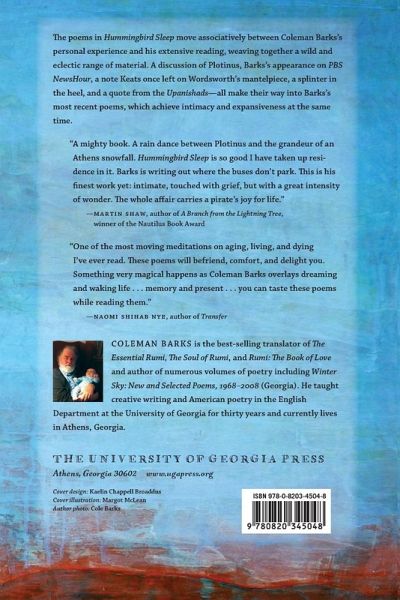 The poems inHummingbird Sleep move associatively between Coleman Barks's personal experience and his extensive reading, weaving together a wild and eclectic range of material. A discussion of Plotinus, Barks's appearance on PBS NewsHour, a note Keats once left on Wordsworth's mantelpiece, a splinter in the heel, and a quote from the Upanishads-all make their way into Barks's most recent poems, which achieve intimacy and expansiveness at the same time.