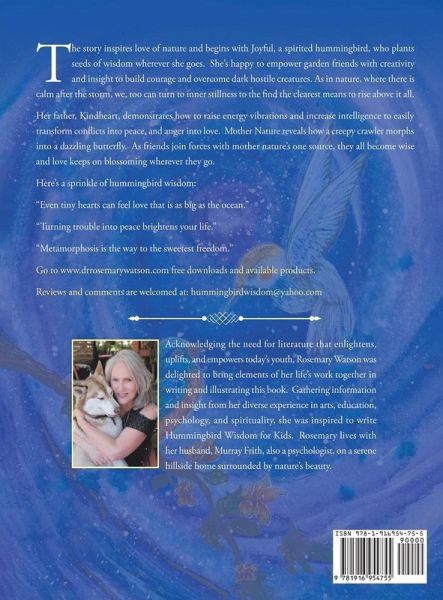 The story inspires love of nature and begins with Joyful, a spirited hummingbird, who plants seeds of wisdom wherever she goes. She's happy to empower garden friends with creativity and insight to build courage and overcome dark hostile creatures. She teaches them that, as in nature where there is calm after the storm, we too can turn to inner stillness to find the clearest means to rise above it all. Her father, Kindheart, demonstrates how to raise energy vibrations and increase intelligence to easily transform conflicts into peace, and anger into love. Mother Nature reveals how a creepy crawler morphs into a dazzling butterfly. As friends join forces with Mother Nature's one source they become wiser, and love keeps blossoming wherever they go. Here's a sprinkle of hummingbird wisdom: "Even tiny hearts can feel love that is as big as the ocean." "Turning trouble into peace brightens your life." "Metamorphosis is the way to the sweetest freedom."