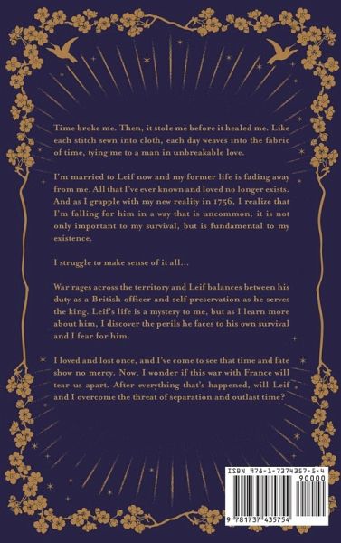 Bound by the heart, stranded in the past. Time broke me. Then, it stole me before it healed me. Like each stitch sewn into cloth, each day weaves into the fabric of time tying me to a man in unbreakable love. I'm married to Leif now and my former life is fading away from me. All that I've ever known and loved no longer exists. And as I grapple with my new reality in 1756, I realize that I'm falling for him in a way that is uncommon; it is not only important to my survival, but is fundamental to my existence. I struggle to make sense of it all... War wages across the territory and Leif balances between his duty as a British officer and self preservation as he serves the king. Leif's life is a mystery to me, but as I learn more about him, I discover the perils he faces to his own survival and I fear for him. I loved and lost once, and I've come to see that time and fate show no mercy. Now, I wonder if this war with France will tear us apart. After everything that's happened, will Leif and I overcome the threat of separation and outlast time?