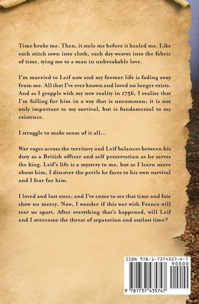 Bound by the heart, stranded in the past. Time broke me. Then, it stole me before it healed me. Like each stitch sewn into cloth, each day weaves into the fabric of time tying me to a man in unbreakable love. I'm married to Leif now and my former life is fading away from me. All that I've ever known and loved no longer exists. And as I grapple with my new reality in 1756, I realize that I'm falling for him in a way that is uncommon; it is not only important to my survival, but is fundamental to my existence. I struggle to make sense of it all... War wages across the territory and Leif balances between his duty as a British officer and self preservation as he serves the king. Leif's life is a mystery to me, but as I learn more about him, I discover the perils he faces to his own survival and I fear for him. I loved and lost once, and I've come to see that time and fate show no mercy. Now, I wonder if this war with France will tear us apart. After everything that's happened, will Leif and I overcome the threat of separation and outlast time?