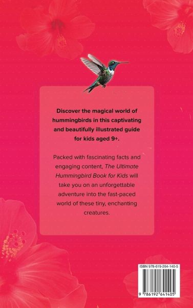 Discover the Enchanting World of Hummingbirds! Introducing "The Ultimate Hummingbird Book," an engaging and beautifully illustrated guide designed especially for curious kids aged 9 and up. Dive into the fascinating lives of these tiny wonders and explore their unique features, habitats, and behaviors. What's Inside? Introduction to Hummingbirds: Learn about their physical characteristics, dazzling colors, and the environments they call home. Types of Hummingbirds: Uncover the diversity of over 300 hummingbird species and their unique adaptations. Anatomy and Adaptations: Explore the incredible physical structures that enable hummingbirds to hover, zip, and fly like no other bird. Feeding Habits: Discover the hummingbird's love for nectar, their remarkable feeding techniques, and their vital role in pollination. Migration Patterns: Be amazed by the epic journeys these tiny birds undertake and the challenges they face during migration. Breeding and Reproduction: Peek into the world of hummingbird nests, mating rituals, and how they care for their young. Threats and Conservation: Understand the impact of habitat loss and climate change on hummingbirds and how we can help protect them. Fun Facts: Enjoy a collection of interesting and little-known facts about hummingbirds that will leave you in awe. Hummingbirds in Culture : Delve into the myths, legends, and cultural significance of these remarkable birds. Why Choose This Book? Specially designed for curious kids aged 9+, it's packed with engaging content and beautiful illustrations. Perfect for sparking a love for nature and the world of birds, it will inspire learning and foster a sense of wonder and curiosity. Embark on a captivating journey into the world of hummingbirds and inspire the young explorer in your life. Grab your copy of "The Ultimate Hummingbird Book" today and let the adventure begin!