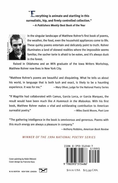 A Publishers Weekly Best Book of the Year; winner of the 1994 National Poetry Series. In the singular landscape of Matthew Rohrer's first book of poems, the weather, the food, even the household appliances come to life. "A few pages into this book," says the Minneapolis City Pages, "and you'll start glancing sideways at the terrain, which . . . looks suddenly vital." These quirky poems entertain and delicately point to truth. Rohrer illuminates a land of skewed realities where the impossible seems familiar, the sacher torte is afraid to be eaten, and it's always dusk in the forest.