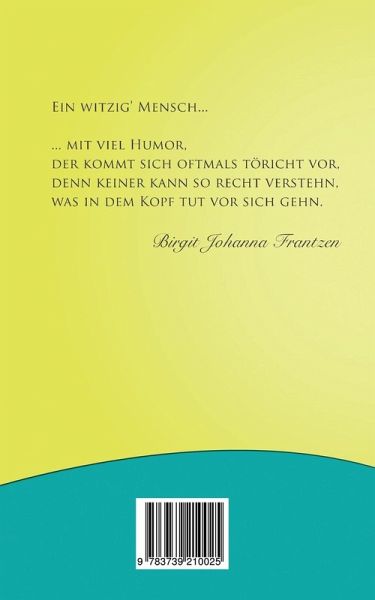 In diesem Buch sind die reichhaltigen Ideen von Birgit Johanna Frantzen, gepaart mit den authentischen Erlebnissen ihres bunten Alltags und den Eindrücken durch die ihr begegnenden Mitmenschen, in humoristischen Versen festgehalten.