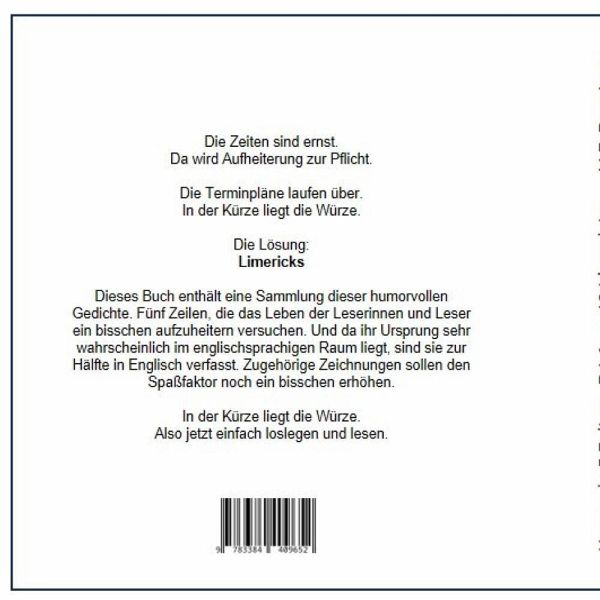Limericks sind Humor in aller Kürze (5 Zeilen), die eine ungewöhnliche Situation beschreiben. Limericks kann man hintereinander weg oder auch immer mal wieder nur einen Einzelnen lesen. Viele eignen sich auch zur Gestaltung humorvoller Grußkarten oder als erzählter kleiner Witz. Manchmal erfordern sie auch ein klein bisschen Nachdenken, bis die Pointe deutlich wird. Auch die englischsprachigen Limericks sind meist leicht zu verstehen. Die zugehörigen Zeichnungen sind ggf sehr hilfreich und können schon in sich ein Lächeln hervorlocken.