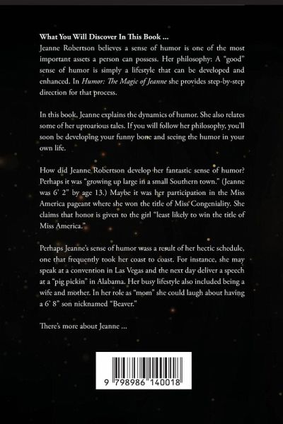 Jeanne Robertson, one of America's most loved and respected speakers, is a humorist who has helped thousands of people add humor to their lives. Now her phenomenal success becomes an open book as she pulls the cork.....and out pop seven 'potions' for developing a sense of humor. Those who sample her potions will develop a refreshing new approach to humor and the magic it works in our daily lives. Jeanne believes a sense of humor is one of the most important assets a person can possess. Her philosophy: a 'good' sense of humor is simply a lifestyle that can be developed and enhanced. In [this book] she provides step-by-step direction for that process. Jeanne explains the dynamics of humor. She also relates some of her uproarious tales. If you follow her philosophy, you'll soon be developing your funny bone and seeing humor in your own life.