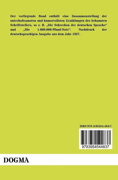 Der vorliegende Band enthält eine Zusammenstellung der unterhaltsamsten und humorvollsten Erzählungen des bekannten Schriftstellers, so z. B. Die Schrecken der deutschen Sprache und Die 1.000.000-Pfund-Note . Nachdruck der deutschsprachigen Ausgabe aus dem Jahr 1927.