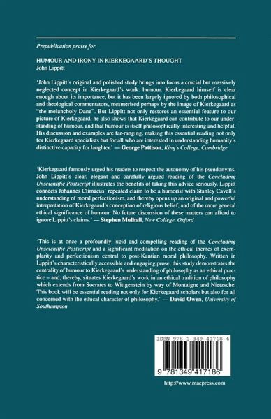 '[I]t does not simply provoke us to argue with it in its own terms but also to engage more deeply with the questions and issues that it addresses...[T]hese questions and issues are of central importance and given...relaively little explicit or sustained attention...in the secondary literature...[T]he relevance of Lippitt's book will therefore be of long-term interest to Kierkegaard scholars...my guess is that it will be of similar long-term interest to philosophers interested in the question of humour...Lippitt's book...has a nice lightness of touch suitable to its topic - and one, I think, that could be enulated in philosophical discussions on very different subjects.' - George Pattison, Soren Kierkegaard Newsletter