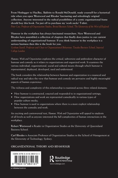 Accessible and amusing in style, Humour, Work and Organization explores the critical, subversive and ambivalent character of humour, work and comedy as it relates to organizations and organized work. It examines the various individual, organizational, social and cultural means through which humour is represented, deployed, developed, used and understood. Considering the relationship between humour and organization in a nuanced and radical way and this book takes the view that humour and comedy are pervasive and highly meaningful aspects of human experience. The richness and complexity of this relationship is examined across three related domains. They are: how humour is constructed, enacted and responded to in organizational settings how organizations and work are represented comedically in various types of popular culture media how humour is used in organizations where there is a more explicit relationship between the comedic and work. An exciting and controversial text, Humour, Work and Organization will appeal to students of all levels as well as anyone interested the full complexities of human interactions in the workplace.