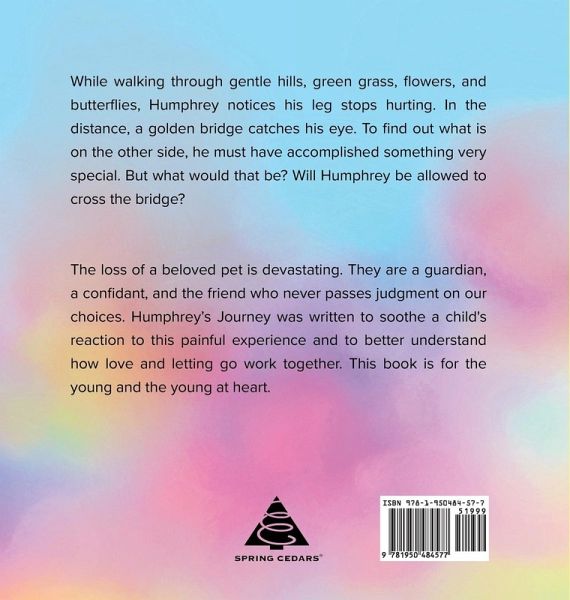 While walking through gentle hills, green grass, flowers, and butterflies, Humphrey notices his leg stops hurting. In the distance, a golden bridge catches his eye. To find out what is on the other side, he must have accomplished something very special. But what would that be? Will Humphrey be allowed to cross the bridge? The loss of a beloved pet is devastating. They are a guardian, a confidant, and the friend who never passes judgment on our choices. Humphrey's Journey was written to soothe a child's reaction to this painful experience and to better understand how love and letting go work together. This book is for the young and the young at heart.