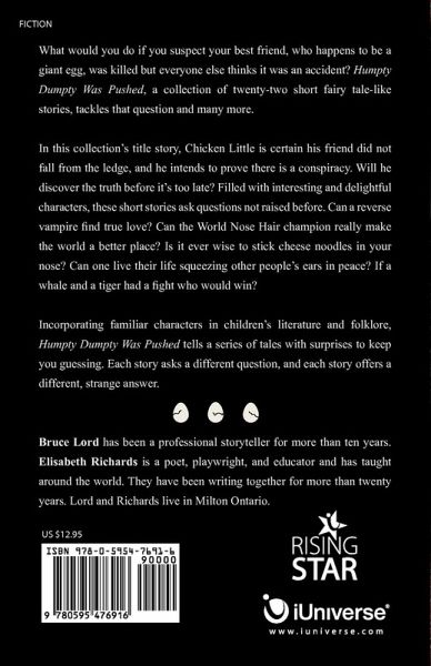 What would you do if you suspect your best friend, who happens to be a giant egg, was killed but everyone else thinks it was an accident? Humpty Dumpty Was Pushed, a collection of twenty-two short fairy tale-like stories, tackles that question and many more. In this collection's title story, Chicken Little is certain his friend did not fall from the ledge, and he intends to prove there is a conspiracy. Will he discover the truth before it's too late? Filled with interesting and delightful characters, these short stories ask questions not raised before. Can a reverse vampire find true love? Can the World Nose Hair champion really make the world a better place? Is it ever wise to stick cheese noodles in your nose? Can one live their life squeezing other people's ears in peace? If a whale and a tiger had a fight who would win? Incorporating familiar characters in children's literature and folklore, Humpty Dumpty Was Pushed tells a series of tales with surprises to keep you guessing. Each story asks a different question, and each story offers a different, strange answer.