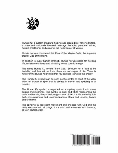 Hunab Ku system of natural healing is a two-part certification process. The first part, the practitioner's manual introduces the student to Hunab Ku, the Mayan God. Students also learn how to use the Hunab Ku symbol to either sedate or tone the chakra system of the body. A chapter of protocols is given in the book to help the student choose which way to use the symbol to help specific conditions that the client may have. Hand positions are given for healing both self and others. Additional ways to use the Hunab Ku symbol on food, pets, jewelry, the environment and more are given. A chapter on how to make and use an Energy Ball will help students to focus the energy in a given area, as well as, to 'trap' negative energies and release them from the body. The Master manual will give students more information on working with the Hunab Ku symbol. After both manuals are read, attunements given and received, and course work finished, the student will receive the attunement process manual by email.