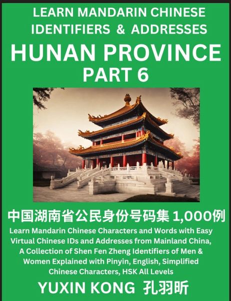 Let's learn Mandarin Chinese while appreciating the Shen Fen Zheng identifiers (¿¿¿¿¿) from different cities and counties of China's Hunan Province (¿¿¿). This book contains 100 imaginary (virtual) Chinese Shen Fen Zheng of men and women of different Chinese ethnic groups to help the students of Mandarin Chinese language understand the concept of Chinese IDs along with associated non-real addresses, postal codes, and phone numbers. The book series contain 10 books and total 1,000 Chinese IDs. Pinyin and English have been provided for all the addresses. The titles are suitable for the students of HSK all levels.