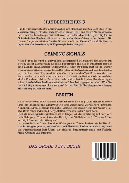 HUNDEERZIEHUNGHundeerziehung ist extrem wichtig aber manchmal gar nicht so leicht. Sie ist die Voraussetzung dafür, dass sich zwischen einem Hund und einem Menschen eine harmonische Beziehung entwickelt. Auch ist die Hundeerziehung wichtig für die Sicherheit des Hundes, z.B. wenn er versucht einen Giftköder zu fressen. Mit diesem Ratgeber erhalten Sie das Wissen, um Ihrem kleinen Freund die Grundlagen der Hundeerziehung in Eigenregie beizubringen.CALMING SIGNALSKeine Frage: Ihr Hund ist einwandfrei erzogen und gut trainiert. Sie kennen ihn genau, achten aufmerksam auf seine Bedürfnisse und haben außerdem bereits eine Menge Hundewissen angesammelt. Aber trotzdem gibt es da immer wieder diese Situationen, in denen Sie ratlos sind: Anscheinend aus dem Nichts legt Ihr Hund ein völlig unerklärliches Verhalten an den Tag. Er missachtet Ihre Kommandos, ist ungehorsam und es wirkt, als wäre mit einem Wimpernschlag all die Erziehung dahin. Dann ist es sehr wahrscheinlich, dass Sie einem typischen Hunde-Mensch-Missverständnis auf den Leim gegangen sind. Wie Sie dem künftig entgegenwirken können? Lernen Sie die Hundesprache - lernen Sie Calming Signals kennen! BARFENAls Tierhalter wollen Sie nur das Beste für Ihren Liebling. Dazu gehört in erster Linie die gesunde und ausgewogene Ernährung Ihres Vierbeiners. Tierische Nebenerzeugnisse, billige Füllstoffe, Melasse und Zucker sind nur wenige Bestandteile eines industriell hergestellten Trocken- oder Nassfutters. Deshalb überlegen Sie vielleicht schon länger, ob die Ernährung mit dem vermeintlich guten Trockenfutter das Richtige ist. Vielleicht hat Ihr Tier auch Unverträglichkeiten oder Allergien? In diesem Buch erfahren Sie alles Wichtige zum Thema Barfen, ob Ihr Tier für das Barfen geeignet ist, welche Vor- und Nachteile Barfen mit sich bringt und die verschiedenen Barf-Arten, die richtige Zusammensetzung von Fleisch, Fisch, Gemüse und Zusätzen.DAS GROßE 3 IN 1 BUCH!