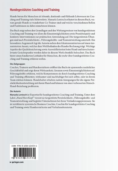 Das Buch zeigt neben den Grundlagen und den Wirkungsweisen von hundegestütztem Coaching und Training vor allem die Einsatzmöglichkeiten sowie Praxisbeispiele und konkrete Interventionen zur praktischen Anwendung auf. Die tiergestützten Übungen sind nach Persönlichkeits-, Führungskräfte- und Teamentwicklung unterteilt. Ein besonderes Augenmerk legt die Autorin neben dem klientenzentrierten auf einen tierzentrierten Ansatz, welcher dem Wohlbefinden des Hundes Rechnung trägt. Wichtige Aspekte der Qualitätssicherung sowie Auswahlkriterien beim Hund und tierschutzrelevante Gesichtspunkte werden daher in diesem Werk ebenfalls beleuchtet. Das Buch bietet einen fundierten Leitfaden für Menschen, die mehr überhundegestütztes Coaching und Training erfahren wollen.