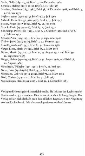 Über ein halbes Jahrhundert hinweg verschickte Siegfried Unseld täglich zahlreiche Briefe. So finden sich in den Archiven heute über 50.000 eigenhändig geschriebene oder auch diktierte Schreiben. Aus dieser Fülle haben die Herausgeber 100 exemplarische Briefe ausgewählt und kenntnisreich kommentiert. In dem, was Siegfried Unseld Ingeborg Bachmann, Samuel Beckett, Ignatz Bubis, Hans Magnus Enzensberger, Max Frisch, Henry Kissinger, Autorinnen wie Autoren, Verlegern, Journalistinnen mitteilte, spiegelt sich nicht nur Unselds Denken. Diese Briefe dokumentieren eindrucksvoll und vielfältig die intellektuelle Geschichte der Bundesrepublik.