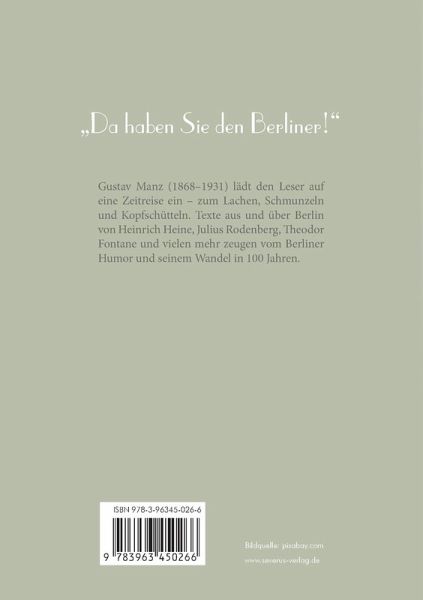 Gustav Manz (1868-1931) lädt den Leser auf eine Zeitreise ein - zum Lachen, Schmunzeln und Kopfschütteln. Texte aus und über Berlin von Heinrich Heine, Julius Rodenberg, Theodor Fontane und vielen mehr zeugen vom Berliner Humor und seinem Wandel in 100 Jahren.