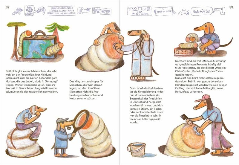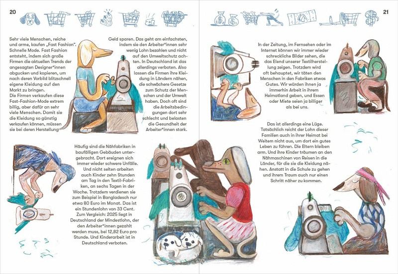 Im letzten Kapitel „unterhalten“ sich die Beteiligten dieses informativen Buches darüber, wie sie mit diesem Thema umgehen. Deshalb gibt es ein kunterbuntes Bild mit Repair-Café und Tauschladen.