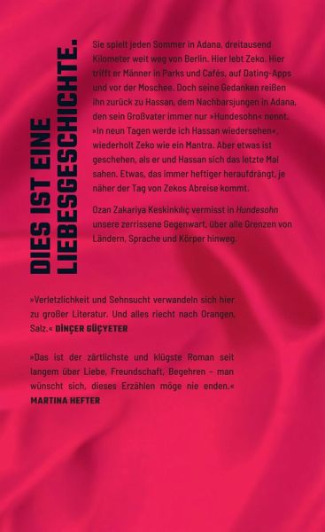 Dies ist eine Liebesgeschichte. Sie spielt im Juni, im Juli, im August in Adana, dreitausend Kilometer weit weg von Berlin. In Berlin lebt Zeko. Hier trifft er Männer in Parks und Cafés, auf Dating-Apps und vor der Moschee. Doch jedes Mal, wenn sich ihre Lippen berühren, reißen ihn die Gedanken zurück zu Hassan, dem Nachbarsjungen in Adana, den Dede, sein Großvater, immer nur »Hundesohn« nennt. Zeko kennt das laute Viertel, den Staub in den Gassen nur aus den Sommerferien. Dann stirbt Dede an einem Herzinfarkt. Aber Zeko will nicht vergessen, nicht den Großvater, der alten Männern die Sorgen aus dem Bart schnitt und auf Arabisch sang, nicht die religiösen Rituale und den Geschmack von Bamya. Und vor allem nicht Hassan.