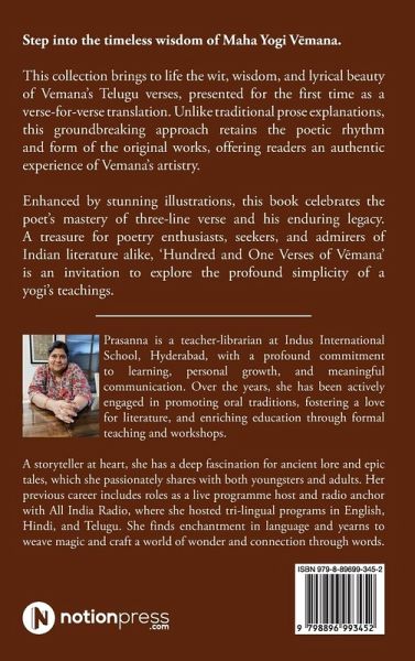 Step into the timeless wisdom of Maha Yogi Vēmana. This collection brings to life the wit, wisdom, and lyrical beauty of Vemana's Telugu verses, presented for the first time as a verse-for-verse translation. Unlike traditional prose explanations, this groundbreaking approach retains the poetic rhythm and form of the original works, offering readers an authentic experience of Vemana's artistry. Enhanced by stunning illustrations, this book celebrates the poet's mastery of three-line verse and his enduring legacy. A treasure for poetry enthusiasts, seekers, and admirers of Indian literature alike, 'Hundred and One Verses of Vēmana' is an invitation to explore the profound simplicity of a yogi's teachings.
