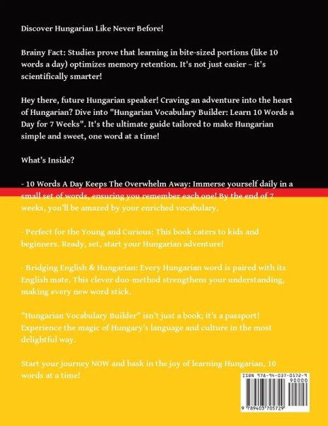 Dive into the fascinating world of Hungarian with 'Hungarian Vocabulary Builder: Learn 10 Words a Day for 7 Weeks.' This carefully crafted guide is designed to introduce both young learners and beginners to the beauty of the Hungarian language.Based on scientific studies that support memory retention through bite-sized learning, this book presents 10 Hungarian words daily, ensuring that each one sticks with you. In just 7 weeks, you'll be amazed by your enriched vocabulary.Perfect for kids and beginners, this book bridges the gap between English and Hungarian by pairing each Hungarian word with its English counterpart. It's not just a book; it's your passport to the magical world of Hungary's language and culture.Don't wait any longer to start your Hungarian adventure. Begin now and experience the joy of learning Hungarian, 10 words at a time!