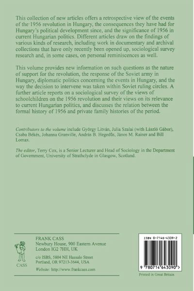 This collection of new articles offers a retrospective view of the events of the 1956 revolution in Hungary, the consequences they have had for Hungary's political development since, and the significance of 1956 in current Hungarian politics. Different articles draw on the findings of various kinds of research, including work in documentary and archival collections that have only recently been opened up, sociological survey research, and in some cases, on personal reminiscences as well.