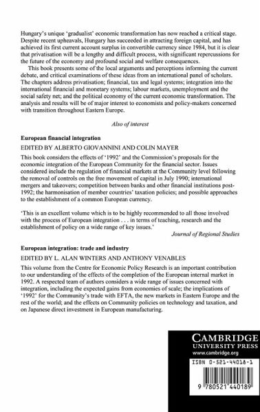 The economic transformation of Hungary has reached a critical stage. Hungary has succeeded in attracting foreign captial, and has achieved its first current account surplus in convertible currency since 1984, despite recent upheavals, but the privatization process has reached a crucial stage. It is clear that it will be a lengthy and difficult process, with significant repercussions for the future of the economy and profound social and welfare consequences. This book presents some of the local arguments and perceptions informing the current debate, and critical examination of these ideas from an international panel of scholars. The chapters address privatization; financial, tax and legal systems; integration into the international financial and monetary systems; labour markets, unemployment and the social safety net; and the political economy of the current economic transformation.