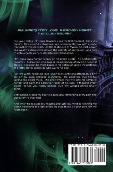 An unrequited love. A broken heart. A stolen secret. I've loved Kaldur of House Kaalium since the first moment I laid eyes on him. He's a sinfully charming, lore-smoking playboy with a smile that makes me see stars. As the High Lord of Vyaan, his vast power and wealth extends throughout the entirety of our nation-and he's as untouchable as he is devastatingly handsome. Me? I'm a lowly human keeper on his grand estate. An orphan with no family. A dreamer, who lives in the adventure of my own fictional stories. I couldn't be more beneath his notice or unlike the plethora of pretty, clever socialites who warm his bed. For two years, he has no idea I even exist...until one afternoon, a tiny cut on my palm changes everything. He discovers that I'm his kyrana, his blood mate. The one female that will sate his vampiric hunger and calm the berserker rages of his race. I thought every dream I'd had was finally coming true-my winged prince finally come. Until Kaldur breaks my heart so callously, reinforcing every pain and insecurity I'd ever had. And when he realizes his mistake and sets his mind to winning me back? He'll have the fight of his life if he thinks I'll ever give him my heart again.