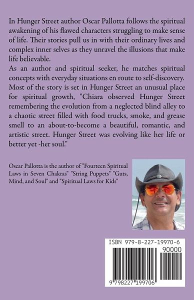 In Hunger Street author Oscar Pallotta follows the spiritual awakening of his flawed characters struggling to make sense of life. Their stories pull us in with their ordinary lives and complex inner selves as they unravel the illusions that make life believable. As an author and spiritual seeker, he matches spiritual concepts with everyday situations en route to self-discovery, "we identify with our ego, our mind, and our thoughts, but we are neither, we are ineffable souls." Most of the story is set in Hunger Street an unusual place for spiritual growth, "Chiara observed Hunger Street remembering the evolution from a neglected blind alley to a chaotic street filled with food trucks, smoke, and grease smell to an about-to-become a beautiful, romantic, and artistic street. Hunger Street was evolving like her life or better yet -her soul."