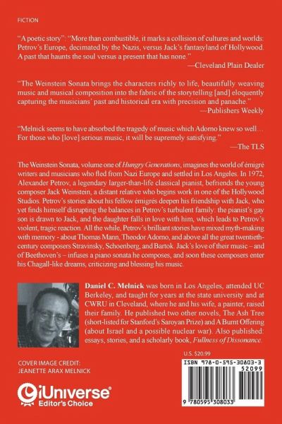 "A poetic story": "More than combustible, it marks a collision of cultures and worlds: Petrov's Europe, decimated by the Nazis, versus Jack's fantasyland of Hollywood. A past that haunts the soul versus a present that has none." --Cleveland Plain Dealer "The Weinstein Sonata brings the characters richly to life, beautifully weaving music and musical composition into the fabric of the storytelling [and] eloquently capturing the musicians' past and historical era with precision and panache." --Publishers Weekly "Melnick seems to have absorbed the tragedy of music which Adorno knew so well...For those who [love] serious music, it will be supremely satisfying." --The TLS The Weinstein Sonata, volume one of Hungry Generations, imagines the world of émigré writers and musicians who fled from Nazi Europe and settled in Los Angeles. In 1972, Alexander Petrov, a legendary larger-than-life classical pianist, befriends the young composer Jack Weinstein, a distant relative who begins work in one of the Hollywood Studios. Petrov's stories about his fellow émigrés deepen his friendship with Jack, who yet finds himself disrupting the balances in Petrov's turbulent family: the pianist's gay son is drawn to Jack, and the daughter falls in love with him, which leads to Petrov's violent, tragic reaction. All the while, Petrov's brilliant stories have mixed myth-making with memory - about Thomas Mann, Theodor Adorno, and above all the great twentieth-century composers Stravinsky, Schoenberg, and Bartok. Jack's love of their music - and of Beethoven's - infuses a piano sonata he composes, and soon these composers enter his Chagall-like dreams, criticizing and blessing his music.