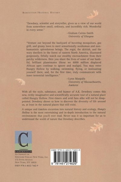 Hungry Hollow is simply an ordinary creek winding through about a mile of ordinary forest and meadow somewhere east of the Rocky Mountains. But like all such places, it is also a vast and intricate web of life with extensions that reach around the planet, back into prehistoric time, and within to a teeming, bizarre microscopic world. In dozens of short, wonderfully imaginative chapters, A.K. Dewdney introduces us to the denizens of this world. We encounter a hackberry tree whose branches perfectly reproduce the taxonomic Tree of Life, learn how it would look and feel to shrink by stages to the size of an amoeba while swimming in a river, watch a toad win the lottery, and see the world of Hungry Hollow from the viewpoint of bears, earthworms, and even stones. This is an excursion into natural history like no other.