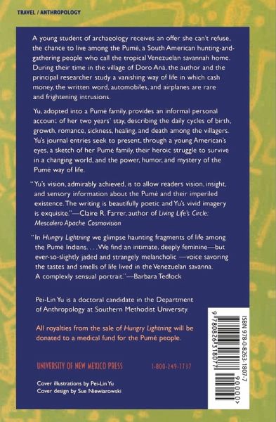 A young student of anthropology receives an offer she can't refuse: the chance to live among the Pumé, a South American hunting-and-gathering people who call the tropical Venezuelan savannah home. During their time in the village of Doro Aná, the author and the principal researcher study a vanishing way of life in which cash money, the written word, automobiles, and airplanes are rare and frightening intrusions. Adopted into a Pumé family, Yu's informal and personal accounts of events during her two year stay sparkle with descriptive flourishes and turns of phrase as she describes the daily cycles of birth, growth, romance, sickness, healing, and death among the villagers. Enlivened with the author's own illustrations, Yu's journal entries seek to present through a young American's eyes a sketch of her Pumé family, their heroic struggle to survive in a changing world, and the power and mystery of the Pumé way of life. "In Hungry Lightning we glimpse haunting fragments of life among the Pumé Indians. We find an intimate, deeply feminine--but ever-so-slightly jaded and strangely melancholic--voice savoring the tastes and smells of life lived in the Venezuelan savanna. A complexly sensual portrait."--Barbara Tedlock ABOUT THE CONTRIBUTORS Pei-Lin Yu is an archaeologist at the U.S. Bureau of Reclamation's Pacific Northwest Regional Office in Boise, Idaho. She won the 1998 Goodbey Author's Award from Southern Methodist University, Dallas, for Hungry Lightning.