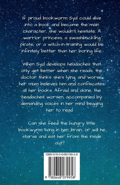 If proud bookworm Syd could dive into a book and become the main character, she wouldn't hesitate. A warrior princess, a swashbuckling pirate, or a witch-in-training would be infinitely better than her boring life. When Syd develops headaches that only get better when she reads, the doctor thinks she's lying, and worse, her mum believes him and confiscates all her books. Afraid and alone, the headaches worsen, accompanied by demanding voices in her mind begging her to read. Can she feed the hungry little bookwyrm living in her brain, or will he starve and eat her from the inside out?