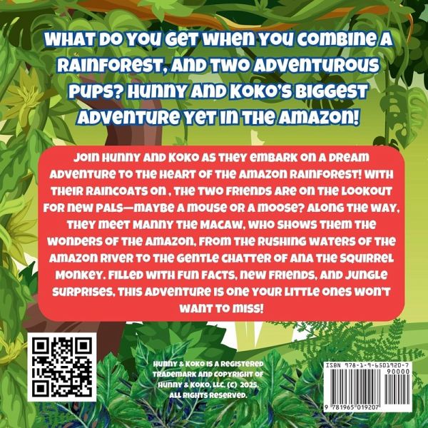 Hunny and Koko are off on an exciting new adventure to the heart of the Amazon rainforest! In a swirl of dreams, they find themselves surrounded by towering canopy trees, colorful birds, and the sounds of rustling leaves. Guided by Manny the Macaw, the duo explores the wonders of this magical rainforest, meeting friendly creatures like Ana the Squirrel Monkey and learning about the mighty Amazon River. From discovering the unique wildlife to hearing the rhythm of the rainforest, Hunny and Koko's journey is filled with surprises, laughter, and unforgettable moments. Perfect for ages 3-7, Hunny & Koko Visit The Amazon is an engaging and educational story that introduces young readers to the wonders of the natural world. With its lovable characters, playful adventures, and a dash of imagination, this book is sure to inspire little explorers to dream big and appreciate the world around them!