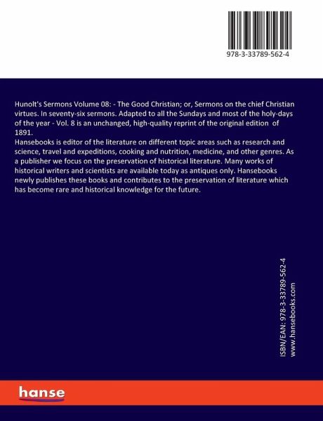Hunolt's Sermons Volume 08: - The Good Christian; or, Sermons on the chief Christian virtues. In seventy-six sermons. Adapted to all the Sundays and most of the holy-days of the year - Vol. 8 is an unchanged, high-quality reprint of the original edition of 1891.Hansebooks is editor of the literature on different topic areas such as research and science, travel and expeditions, cooking and nutrition, medicine, and other genres. As a publisher we focus on the preservation of historical literature. Many works of historical writers and scientists are available today as antiques only. Hansebooks newly publishes these books and contributes to the preservation of literature which has become rare and historical knowledge for the future.