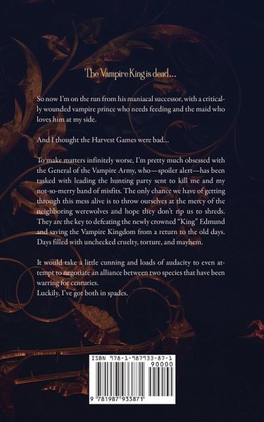 The Vampire King is dead... So now I'm on the run from his maniacal successor, with a critically wounded vampire prince who needs feeding and the maid who loves him at my side. And I thought the Harvest Games were bad... To make matters infinitely worse, I'm pretty much obsessed with the General of the Vampire Army, who-spoiler alert-has been tasked with leading the hunting party sent to kill me and my not-so-merry band of misfits. The only chance we have of getting through this mess alive is to throw ourselves at the mercy of the neighboring werewolves and hope they don't rip us to shreds. They are the key to defeating the newly crowned "King" Edmund and saving the Vampire Kingdom from a return to the old days. Days filled with unchecked cruelty, torture, and mayhem. It would take a little cunning and loads of audacity to even attempt to negotiate an alliance between two species that have been warring for centuries. Luckily, I've got both in spades.