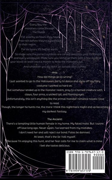 Ana: How did things go so wrong? I just wanted to go to the Halloween party to dance and show off my fairy costume I worked so hard on. But somehow I ended up in the monster realm, prey to a horned creature with claws, four arms, a wicked tail, and flaming eyes. Unfortunately, this isn't anything like the primal monster romance novels I love to read. Though, the longer he hunts me, the more I think this nightmare might end up becoming my darkest fantasy. The Ancient: There's a tempting little human female in my home. My fated mate. But I swore off love long ago. Never again. I've learned from my mistakes. I don't need her and will reject our bond. Fates be damned. At least, that's the lie I tell myself. Because I'm enjoying this hunt, and her fear calls for me to claim what is mine. I bet she tastes delicious.