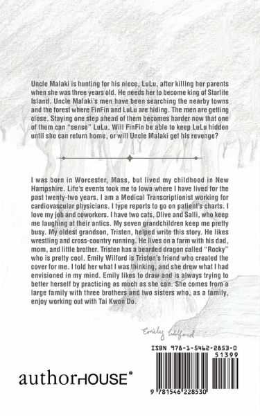 Uncle Malaki is hunting for his niece, LuLu, after killing her parents when she was three years old. He needs her to become king of Starlite Island. Uncle Malakis men have been searching the nearby towns and the forest where FinFin and LuLu are hiding. The men are getting close. Staying one step ahead of them becomes harder now that one of them can sense LuLu. Will FinFin be able to keep LuLu hidden until she can return home, or will Uncle Malaki get his revenge?
