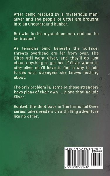 After being rescued by a mysterious man, Silver and the people of Ortus are brought into an underground bunker. But who is this mysterious man, and can he be trusted? As tensions build beneath the surface, threats overhead are far from over. The Elites still want Silver, and they'll do just about anything to get her. If Silver wants to stay alive, she'll have to find a way to join forces with strangers she knows nothing about. The only problem is, some of these strangers have plans of their own.... plans that include Silver. Hunted, the third book in The Immortal Ones series, takes readers on a thrilling adventure like no other.