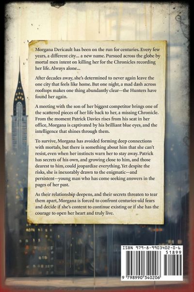 Morgana Dericault is running for her life, and she only has herself to blame... Every few years, it's a new city, a new name. And it's been that way for centuries. Pursued around the world by mortal men intent on killing her for the Chronicles recording her life. Always alone... After decades away, she's determined to never again leave the one city that feels like home. But one night, a mad dash across rooftops makes one thing abundantly clear-the Hunters have found her again. A meeting with the son of her biggest competitor brings one of the scattered pieces of her life back to her, a missing Chronicle. From the moment Patrick Davies rises from his seat in her office, Morgana is captivated by his brilliant blue eyes, and the intelligence that shines through them. There is something about him that she can't resist, even when her instincts warn her to stay away. Patrick has secrets of his own, and growing close to him, and those dearest to him, could jeopardize everything. Yet despite the risks, she is inexorably drawn to the enigmatic-and persistent-young man who has come seeking answers in the pages of her past. As their relationship deepens, and their secrets threaten to tear them apart, Morgana is forced to confront centuries-old fears and decide if she's content to continue existing or if she has the courage to open her heart and truly live.
