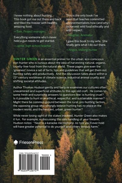 Hunter Green is an essential primer for the urban, eco-conscious non-hunter who is curious about the idea of harvesting natural, organic, cruelty-free food from the natural world. These pages give even the 'greenest' novice a set of facts, tips and guidelines that will get them out hunting safely and productively. And the discussion takes place within a 21st century worldview of climate science, industrial animal cruelty and shifting societal attitudes. Author Thomas Hudson gently and fairly re-examines our cultures often unexamined and superficial attitudes to this age-old craft. He comes to some fresh and surprising answers to questions like: is hunting cruel? Is it possible to hunt in an ethical, respectful, and sustainable manner? Might there be common ground between the rural, pro-hunting faction, the opposing group who strongly believe hunting has no place in the modern world, and the hesitant, urban, green hunter? While never losing sight of the stakes involved, Hunter Green also makes it fun. For example, in discussing the safe handling of your firearm, Hudson notes: "Next to a karaoke microphone, no tool you'll ever hold will have greater potential to do yourself and others serious harm."