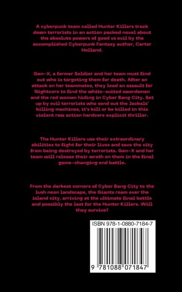Hunter Killers... ...take on cybernetic Terrorists in a cyberpunk future. The hunt is on in the island of Cyber Bang City. Gen-X, a former Soldier and her team, must find out who is targeting them for death. After an attack on her teammates, they lead an assault for Nightcore to find the white-suited swordsman and the red woman hiding in Cyber Bang City. Set up by evil terrorists who send out the Jackals' killing machines, it's kill or be killed in this violent raw action hardcore explicit thriller. The Hunter Killers use their extraordinary abilities to fight for their lives and save the city from being destroyed by terrorists. Gen-X's will release its wrath on them in the final game-changing end battle. From the darkest corners of Cyber Bang City to the lush neon landscape, to the Giants that roam over the island city arriving at the ultimate final battle and possibly the last of the Hunter Killers. Will they survive? If you are fans of Cybercity ODEO 808 and Wicked City with Ghost in the Shell elements. This story is for you. Buy it now!