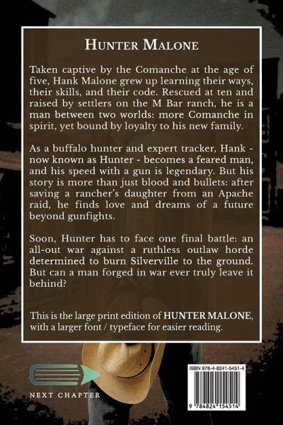 Taken captive by the Comanche at the age of five, Hank Malone grew up learning their ways, their skills, and their code. Rescued at ten and raised by settlers on the M Bar ranch, he is a man between two worlds: more Comanche in spirit, yet bound by loyalty to his new family. As a buffalo hunter and expert tracker, Hank - now known as Hunter - becomes a feared man, and his speed with a gun is legendary. But his story is more than just blood and bullets: after saving a rancher's daughter from an Apache raid, he finds love and dreams of a future beyond gunfights. Soon, Hunter has to face one final battle: an all-out war against a ruthless outlaw horde determined to burn Silverville to the ground. But can a man forged in war ever truly leave it behind? This is the large print edition of Hunter Malone, with a larger font / typeface for easier reading.