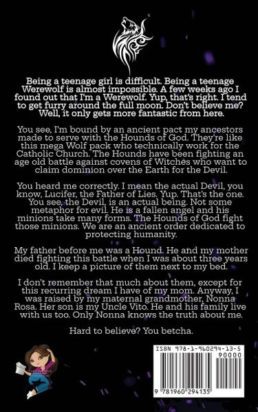 "Being a teenage girl is difficult. Being a teenage Werewolf is almost impossible. A few weeks ago I found out that I'm a Werewolf. Yup, that's right. I tend to get furry around the full moon. Don't believe me? Well, it only gets more fantastic from here. You see, I'm bound by an ancient pact my ancestors made to serve with the Hounds of God. They're like this mega Wolf pack who technically work for the Catholic Church. The Hounds have been fighting an age old battle against covens of Witches who want to claim dominion over the Earth for the Devil. You heard me correctly. I mean the actual Devil, you know, Lucifer, the Father of Lies. Yup. That's the one. You see, the Devil, is an actual being. Not some metaphor for evil. He is a fallen angel and his minions take many forms. The Hounds of God fight those minions. We are an ancient order dedicated to protecting humanity. My father before me was a Hound. He and my mother died fighting this battle when I was about three years old. I keep a picture of them next to my bed. I don't remember that much about them, except for this recurring dream I have of my mom. Anyway, I was raised by my maternal grandmother, Nonna Rosa. Her son is my Uncle Vito. He and his family live with us too. Only Nonna knows the truth about me. Hard to believe? You betcha. I didn't really buy it either until last night when I got all furry and fangy and ripped the throat out of my high school librarian. Scary, right? But they aren't the only things out there. There's much more that I have yet to learn. This world is new to me. It is full of dark and dangerous things. And most of them seem to want me dead. I'm scared, I mean, I'm not crazy. But I have to survive. I just have to. To find out what really happened to my parents. And to avenge them..."