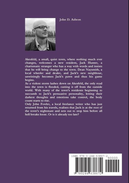 Akesfeld, a small, quiet town, where nothing much ever changes, welcomes a new resident, Jack Hunter, a charismatic stranger who has a way with words and insists that he will bring change to the town. Dean Naysmith, a local wheeler and dealer, and Jack's new neighbour, unwittingly becomes Jack's pawn and thus his game begins. As a violent storm lashes down on Akesfeld, the only road into the town is flooded, cutting it off from the outside world. With many of the town's residents beginning to succumb to Jack's persuasive personality, letting their darkest thoughts and emotions take control, the body count starts to rise. Only John Fowler, a local freelance writer who has just returned from his travels, realises that Jack is at the root of the town's nightmare and sets out to stop him before all hell breaks loose. Or is it already too late?